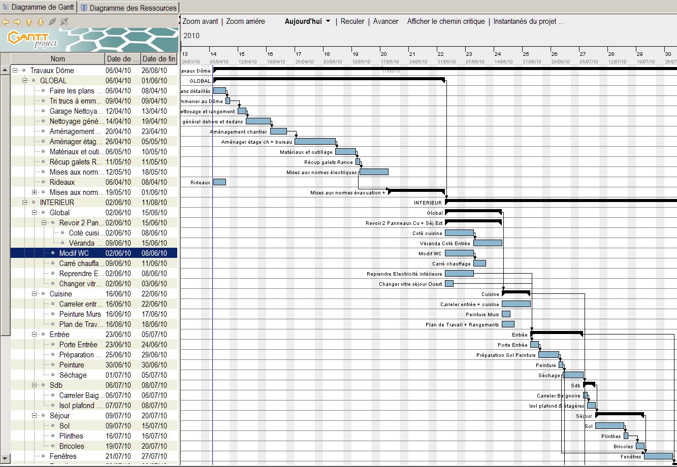 Dans un ouvrage canadien sur les maisons à ossature bois, j’ai découvert qu’ils présentaient couramment des diagrammes de Gantt en même temps que les plans. Je croyais la gestion de projets réservée aux grandes réalisations. L’intérêt de ce genre de diagramme est qu’il permet de visualiser et de faire voir les enchaînements de tâches et de ressources, leurs durées, contraintes et échéances pour anticiper des prises de décision. Comprendre ces méthodes alors que j’avais été chef de projet sur un objectif bien concret m’a donné par la suite un avantage pour trouver des boulots convenables.