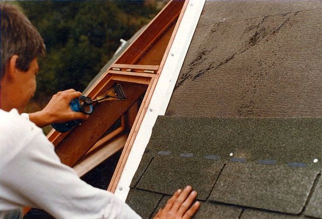 L’étanchéité, ici le shingle collé/cloué/soudé avec une double couche de papier goudronné aura tenu trente ans. Il a fallu deux mois à deux personnes, le plus délicat étant les liaisons avec les profils en acier galvanisé des vitrages, fixes et ouvrants. En rénovation, à 3 professionnels, il a fallu 2 bonnes semaines pour la couverture proprement dite, pendant que je rénovais les profils.