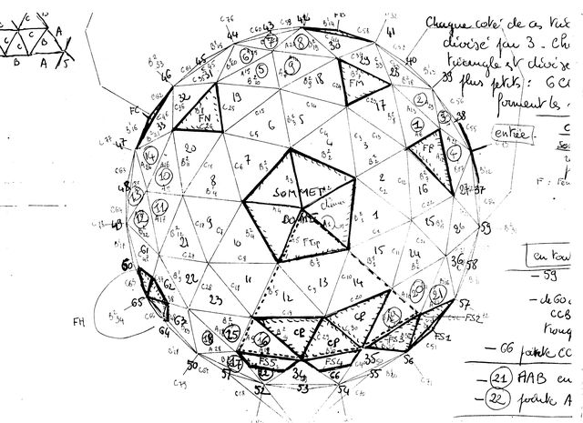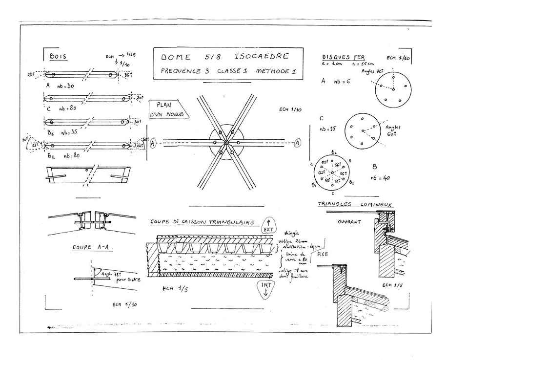 Je suis donc parti sur presque 10 m de diamètre, Icosaèdre en Fréquence 3 et 5/8émes de sphère (plus tard la littérature dira 5/9émes, c’est sans importance) pour 238 m3 répartis avec 63 m² au sol et environ 28 m² de mezzanine. A priori suffisant pour une famille avec 2 enfants.