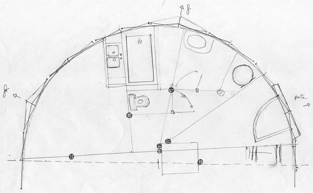 L’aménagement intérieur demande aussi réflexion dès les premiers plans, ne serait ce que parce que les murs sont légèrement courbes (on a lié la courbe du muret de 3 hauteurs de parpaings et le polyèdre à 15 cotés de la base du DG), et aussi parce que les évacuations et arrivées d’eau sont des points fixes, compliqués à déplacer plus tard.