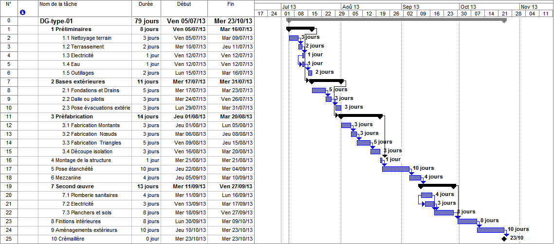 Les plans mis à part, je tenais un cahier au fil des étapes et fait quelques petits diagrammes de Gantt à la main pour bien voir le chaînage des opérations et organiser mon travail, les coups de main, les chaînages entre les tâches. Et des dessins mi-plan, mi-schéma, pour illustrer un point de détail. Maintenant je fais tout avec des logiciels du genre MSProject (payant) ou GanttProject (freeware).