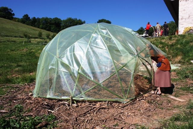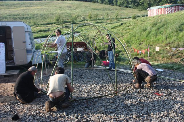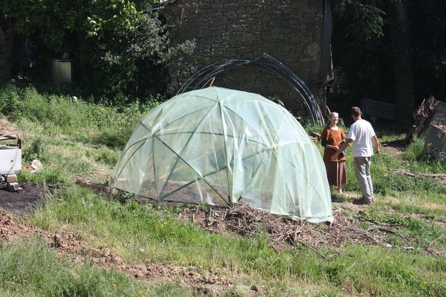 Voici celle qu’on a montée en mai 2015 avec Marc et des amis, en bambou, pour créer une serre mini bulle rapidement et à moindres frais.