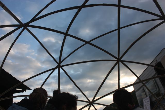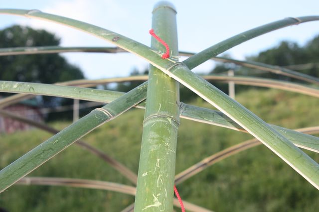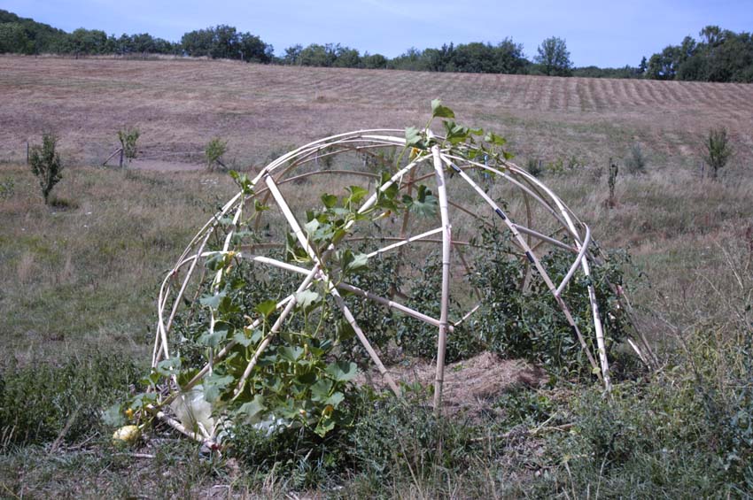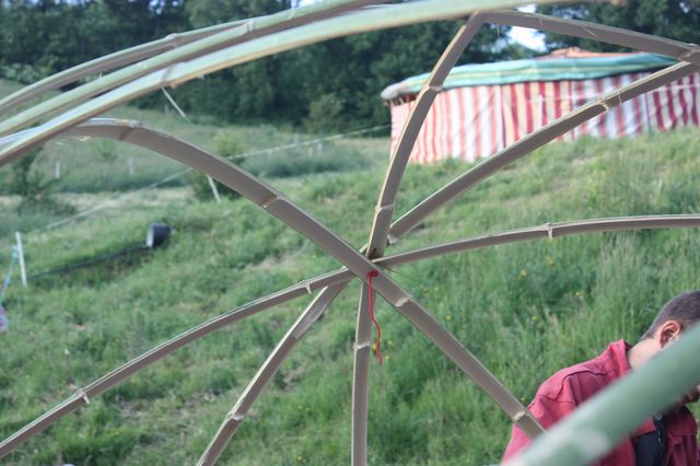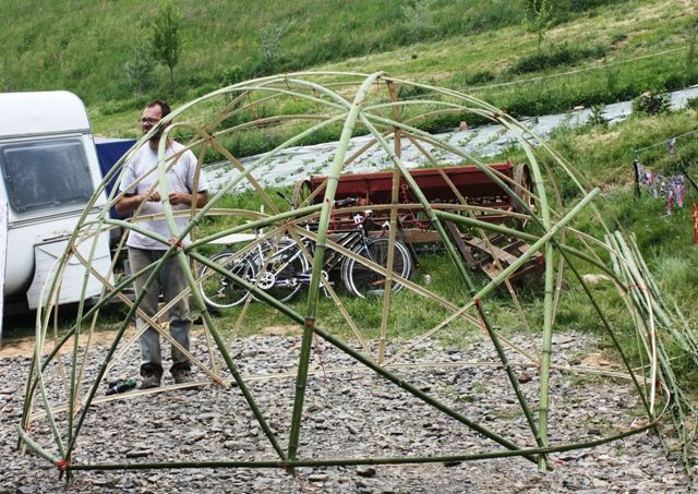 Tant pis pour cette fois, pas tout à fait d’icosaèdre, quoiqu’on soit ici apparenté à un fréquence 2, mais toujours la sphère et c’est le bambou qui la matérialise.