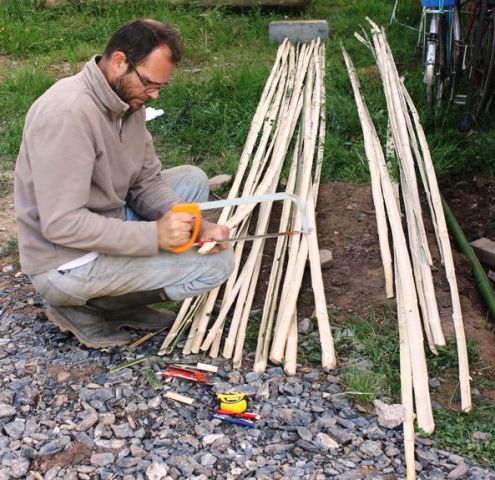 Ce travail se fait bien à 2 personnes en quelques heures si c’est la première fois, trois heures en étant rodés et en maîtrisant un peu mieux ce matériau extraordinaire qu’est le bambou (mettez des gants, ça coupe et ça fait parfois des échardes pointues).